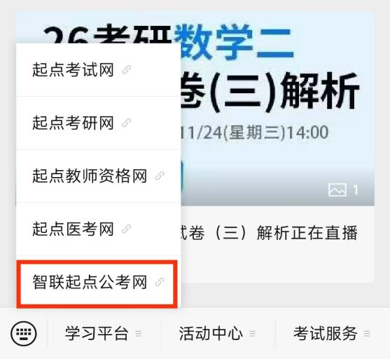 二、移动端:校园网内扫描下图二维码关注起点考试公众号;在“学习平台”中点击“智联起点公考网”注册,登录后不限校内外使用。