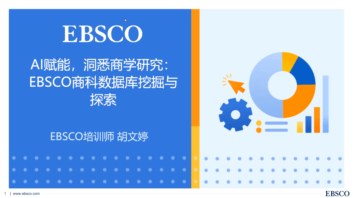 10月28日下午,图书馆联合商学院开展了一场线上培训讲座,EBSCO培训师胡文婷带来主题《AI赋能,洞悉商学研究:EBSCO商科数据库挖掘与探索》并通过操作演示,系统讲解了EBSCOhost平台的基本检索、高级检索、自然语言检索等功能,并结合实际案例,展示了如何利用布尔逻辑、字段限制与通配符等技巧精准获取文献资源。