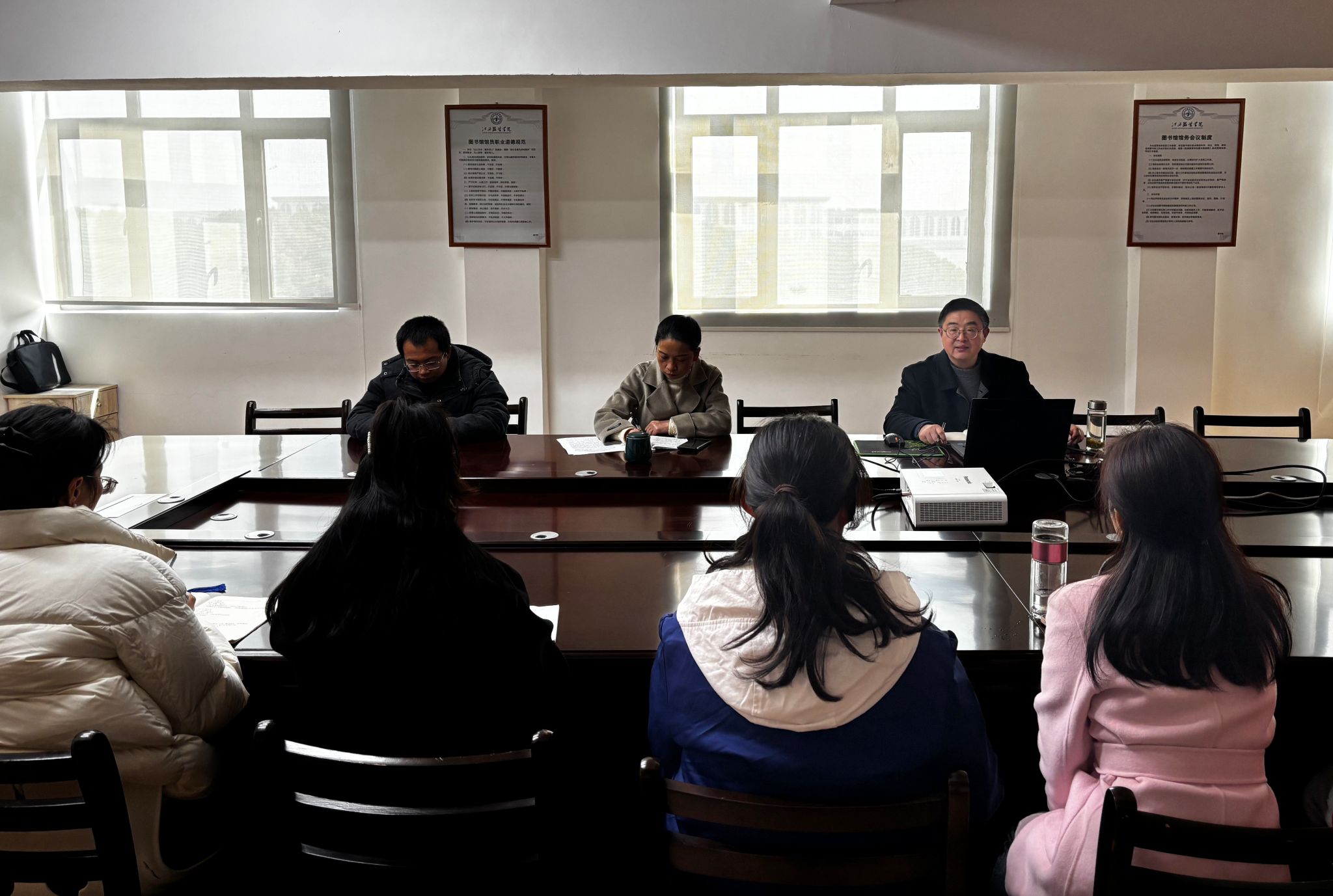 随后,馆长黄顺荣全面回顾了图书馆2025年的工作成效。过去一年,图书馆各项工作硕果累累:荣获省高校图书馆先进集体称号,行业影响力指数排名稳步攀升;党建工作扎实推进,意识形态阵地建设牢固有力;评估工作精准落地,阅读推广活动形式创新、覆盖面广;馆藏资源与服务模式持续优化,学科服务精准有力,接待人次与借阅量均实现增长。同时,会议客观剖析了当前工作中存在的短板与不足,并明确了具体的改进方向与优化路径。