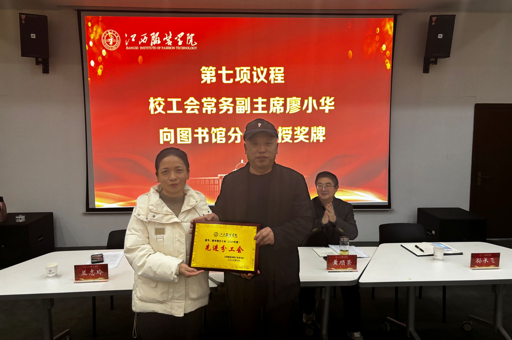 大会进入颁奖环节,现场气氛庄重热烈。校工会常务副主席廖小华代表学校工会,为图书馆分工会颁发2025年度“先进分工会”荣誉奖牌,这一荣誉是对图书馆分工会过去一年工作的高度认可和充分肯定。